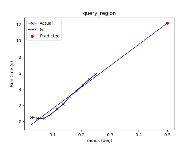 Estimate the execution time and the number of objects for a Cone Search service URL. Estimation only makes sense for a query that would return a huge amount of matches. The prediction naively assumes a linear model, which might not be accurate for some cases. It also uses the normal Cone Search, not the asynchronous version. This example uses a custom timeout of 30 seconds and runs silently (except for warnings):