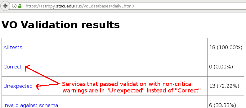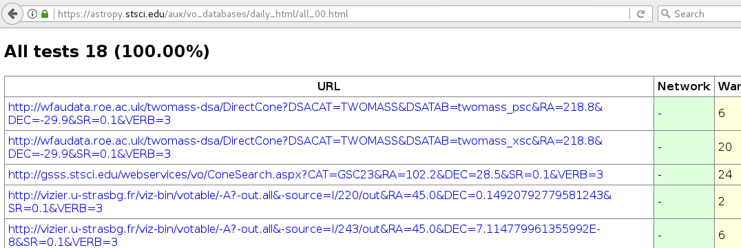 When you click on ‘All tests’ from the page above, you will see all the Cone Search services validated with a summary of validation results: