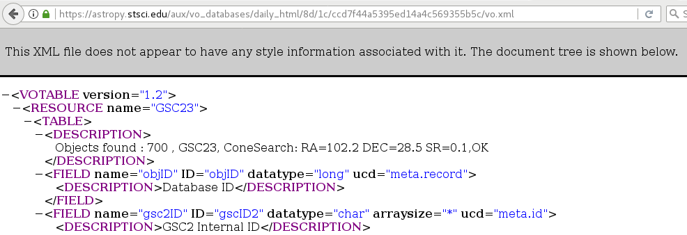 When you click on the URL on top of the page above, you will see the actual VO Table returned by the Cone Search query: